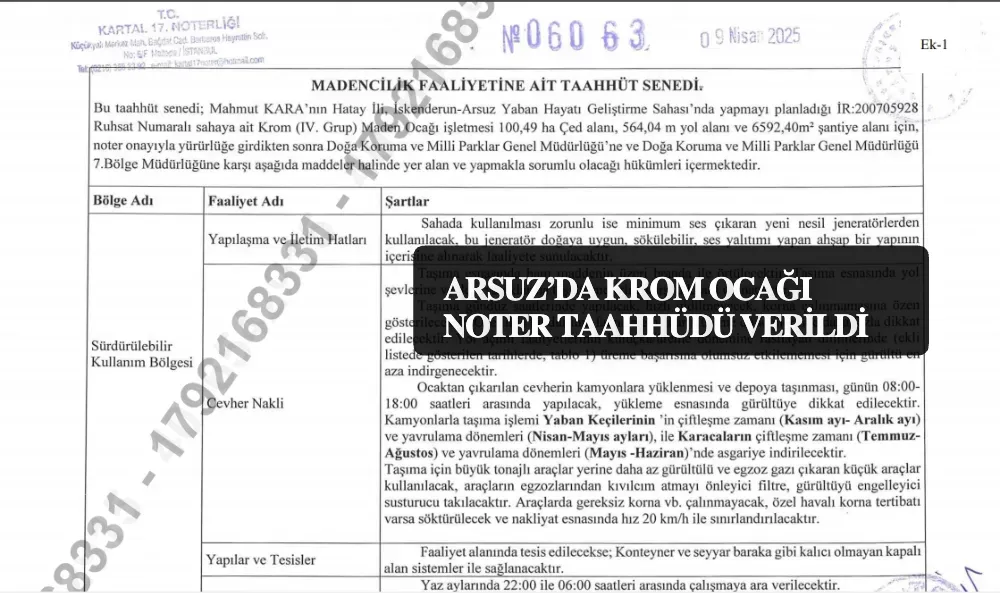 Arsuz’da yapılması planlanan krom ocağı projesiyle ilgili yeni bir gelişme yaşandı. Projeyi yürüten şirketin, faaliyet sürecine ilişkin bazı yükümlülükleri yerine getireceğine dair noter taahhüdü verdiği bildirildi.