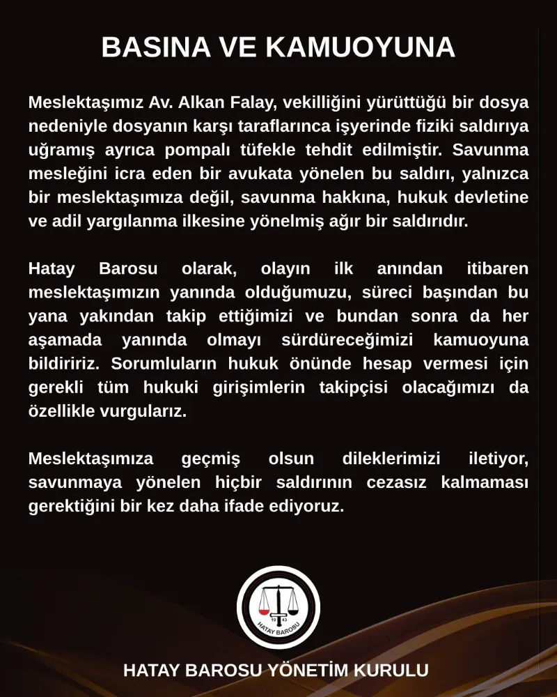 Hatay Barosu, olayın ilk anından itibaren meslektaşlarının yanında olduklarını belirterek hukuki süreci yakından takip edeceklerini açıkladı. Açıklamada ayrıca şu ifadelere yer verildi: “Hatay Barosu olarak, olayın ilk anından itibaren meslektaşımızın yanında olduğumuzu, süreci başından bu yana yakından takip ettiğimizi ve bundan sonra da her aşamada yanında olmayı sürdüreceğimizi kamuoyuna bildiririz. Sorumluların hukuk önünde hesap vermesi için gerekli tüm hukuki girişimlerin takipçisi olacağımızı da özellikle vurgularız.” “Savunmaya yönelik saldırılar cezasız kalmamalı” Baro açıklamasında, savunma mesleğine yönelik saldırıların kabul edilemez olduğu belirtilerek, sorumluların hukuk önünde hesap vermesi gerektiği ifade edildi.